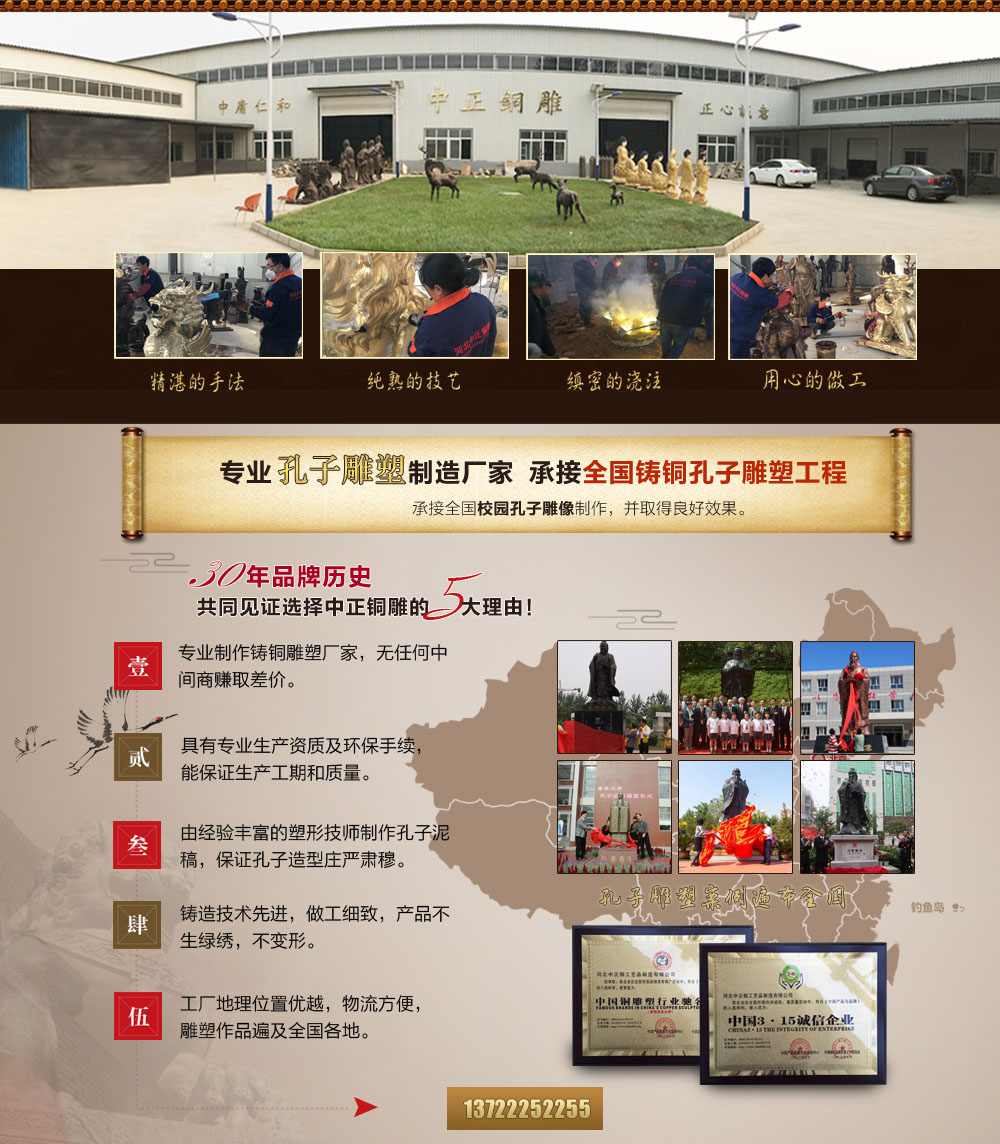 河北中正鑄銅工藝品制造有限公司是一家專業制作鑄銅動物雕塑的生產廠家。擁有完善、大型、先進的鑄造生產設備,并由數位經驗豐富的高級鑄造技師指導生產及制作。我們公司主要鑄造動物銅雕、銅獅子、銅麒麟、銅牛、銅馬、銅鹿、銅大象等,可按客戶提供動物銅雕圖片訂做、加工動物銅雕,動物銅雕塑,我們的產品做工精美,造型生動,用銅扎實,質量有保證。